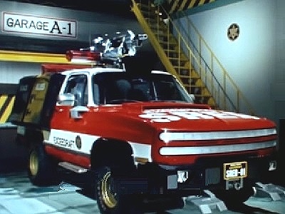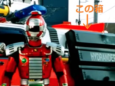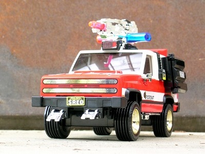 この車両は90年式頃のシボレーブレイザーがベースとなった汎用救急レスキュー車両で、当時の四駆雑誌にも紹介されていますが、屋根上の放水銃なんかよりもリアサイドの救助ツール格納庫が一番リアルさを演出していました。行動隊長ドラフトレッダーの部下二名が装備する強化服・トライジャケットをはじめ、ハンドガンタイプの小型放水銃など各種ツールが格納されていました。