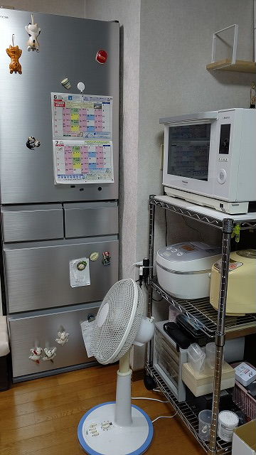 ファックス置いて使ってたラックに延長ポール継いで スライド棚を追加してこういう事になりました。 今までここにあったサイドボードは90度向きを変え ワイヤーラックと背中合わせに置いてあります。 (レンジの)高さが低くなったので使いやすいかと思いきや 手前に開く扉が意外と障害になって奥まで手が届かない(爆) スチーム使った時とか拭くのに一苦労です・・・