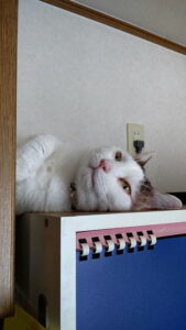 何度も言うけど・・・ 目開いて寝るの止めてください、はな。 毎回ビックリするんだってば。 昨日のオーブンレンジの上から冷蔵庫に 飛び乗るようになって、にゃんぐるじむが また一つ増えました。 お願いだから食器棚へはジャンプしないで・・・ (でも多分そのうちにやる)