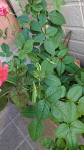 庭から回ってきたのか、裏のマンションから来たのか バラの葉をショリショリと食ってるバッタ・・・ オンブバッタかな??