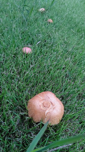 近所の公園。芝生が生えそろって綺麗になりました。 (ぽてぽて歩いて10数分。)← この公園 季節がらかあちこちに〝キノコ〟が・・・ マッシュルーム似のやつやヒラタケっぽい集団とか(笑) 四~五日もすると真っ黒になって土に還っちゃうんですけどね。