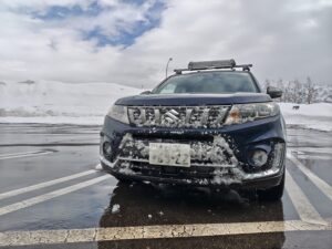 最大の理由はタイヤサイズが純正規格に近い(現在スタッドレス履いている)からですが、フロントにエクステンションバーとかアンダーガードが付いていない分、程度問題ながらΩの方が軽いからかもしれません。軽快と言ってもそこはV6なので、直4のような瞬発力はありませんが、林道レベルでは時速30キロも使わないから充分です。里へ下りてからも田舎道は法定速度で快適です。