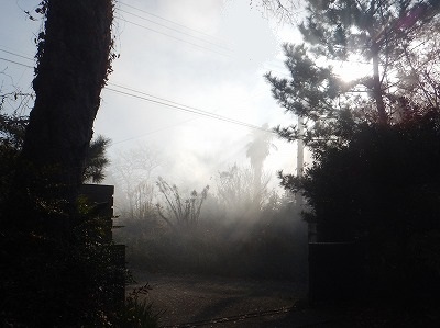 上の写真、朝起き出したら凄い霧で「あー、少しは暖かくなったのか」と思ったけどなんだか焦げ臭い。縁側からの眺めに違和感を覚えて庭に出たら、近所でやっている野焼きの煙でした。これも土の祓い清めかもしれません。