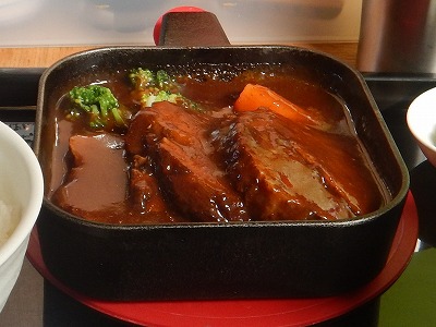 オムハヤシかオムナポあたりと考えていたのに、3月までの冬限定メニューだというビーフシチューを、と口から出てしまいました。普通ビーフシチューってサイコロ状の牛肉が3つくらいごろんと入っているじゃないですか。ここではそうはならず、かなり厚切りの肉が3枚(2枚版もあり)、どすんと放り込まれているのです。サイコロ状換算なら6個くらい。これはすばらしい。味も抜群です。おしいくいただきお腹いっぱいで店を出たらやっぱり長蛇の列ができていましたよ。