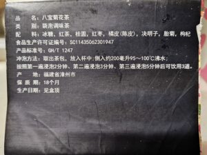原材料: 氷砂糖、紅茶、リュウガン、ナツメ、オレンジの皮、カシアの種、菊、クコの実