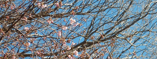しばらく近寄らなかったいつもの桜の木。 暖かいから、もうそろそろ?なんて行ってみたら 咲いてました・・・(ただし、幹についてる花だけ) 枝先の蕾はまだまだカチカチで、ピンクの欠片も無く。 ほころぶのはまだ先かなー。