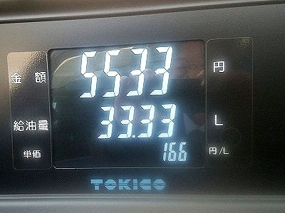 入院する前のことですから、今はもう少し単価が下がっています。このときもトリップメータを撮り忘れましたがだいたい350キロ走っての給油で、燃料代もいくらか落ち着いたかなあとか思って給油機が止まるのを見ていたら、これです。