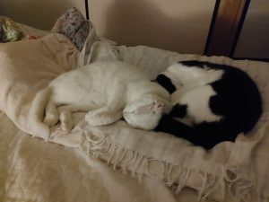 私よりも先に寝室に行って寝てる猫ず。
