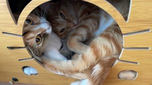 最近ミミがお気に入りの爪とぎ兼つぐら。 いつものように籠ってお昼寝していたら チャチャが乱入・・・3kgに乗っかる5kg ミミの中身が出やしないか心配だわ。