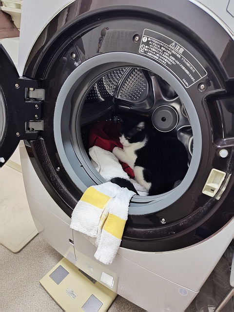 アイスパック交換しに帰った時に 猫ずの確認していたら、いちだけが どこにも見当たらなくて・・・ 2階探して下のリビングと和室探して カーテン捲ってトイレまで確認してたら。 洗濯機の中で寝てました・・・ マジで焦ったんだってば。