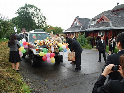 さすがに両家に対して「これくっつけて走らせたらひんしゅく買うんじゃないか?」とペール缶は遠慮しました。しかし「あらかわいい」とも言ってもらえましたが「なんでアライグマ?」という声があちこちから寄せられ、「だって一度にたくさん並べられるのこれしかなくってさー」と冷や汗を流したのも事実です。いずれにしても、これほど大事な機会にこんな大それたことを許していただいたふっじいさんご夫妻に感謝です。