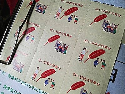 あの赤い羽根、鶏のものを使っていたのですが近年、育成数が減少したとかで生産困難になったという理由で、令和になってから「ありがとうシール」に切り替わりだしているのです。遂に我が家のある街もそうなりました。裏側には作り手側のコスト縮減も透けて見えるけど・・・