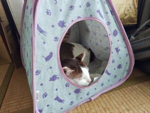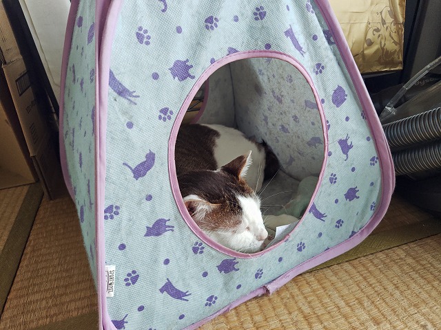 夏の暑い時は極力涼しい所を探して寝てた猫ず。 (の割には押し入れに籠るとか謎なんだけど) ここしばらくは見える所に転がってます。 久しぶりに猫テントに入って寝るはな。 これの前はいちが寝てたわ・・・大人気だね(笑)