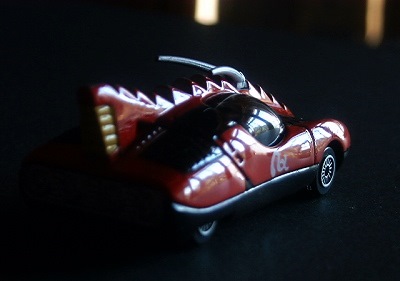 仮面ライダーに真紅のマシンが無かったわけではありませんが、スポーツカーをベースとするスーパーマシンは紅くなっちゃうところも脳軟化思考の気がします。いいかげん、ヒーローと正義と熱い血潮の赤というステレオタイプなコードは、戦隊だけに封じ込めておくべきじゃないかと思うのは、こういうカラーリングを連綿と幼児に植え付けることが、スポンサー様に逆らえない世代を今後も生み出していく刷り込みなのではないかと危惧するからです。
