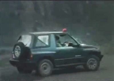 幌車にパトライトどうやってくっつけるんだ? とびっくりですが、フロントグラス上部のフレームにはそこそこの幅があり、レザートップをかぶせてもマグネット取り付けは可能です。年次が89年スタートの番組ですから、このエスクードは1型。ドアにESCUDOのバッジをつけていることで識別できます。しかしパトライト以外は何一つ架装されていないどノーマルで、どうやらATモデル(1型なので3速)です。どうでもいいことですが、うちのぷらすBLUEと同じ車体色。