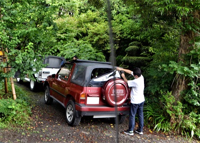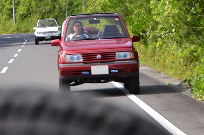 笑っちゃう話ですが、それぞれ古い車だったり久々のオープン化だったりで、「あれっ?幌骨が収納状態からはずれねー」(僕)、「幌が収縮しててファスナー固まってるなあ」(AMGさん)、「むむむっ、うちはファスナー咬みこんでるし」(はまたにさん)というまあけっこうドタバタ劇が繰り広げられていたのでした。しかし走り出してしまえば今どき見かけない三台ものエスクードコンバーチブル。周囲の注目浴びまくりです。