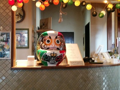 やー、これはやられましたよと入店すると、イタリアンなだるまさんが出迎えるではありませんか。なにやら少し前にパスタのコンクールで優勝した証だそうですが、思わず抱え上げたくなるような、前衛的な塗分け方です。おまけに建物の外見からは想像できない、どこからどう切っても洋食屋の内装。でもってこの時点で我々、店名を読み間違えていて「日仏伊同盟か」などと馬鹿なことを話していたのがこっ恥ずかしい。