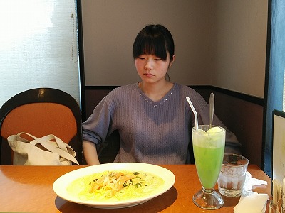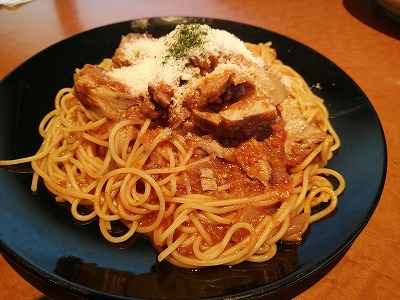 2人とも空腹だったので、大盛りにしようかとオーダーになりますが念のため麺は何グラムでしょうか?と尋ねたら三百グラムとのことで、いかんいかんそこからの大盛りは食いきれんよと余計なことを言うのは慎みます。飲み物でもドリンクバーを薦められましたが丁重に遠慮して、逆に不思議な顔をされ、取り分け皿は持ち帰られてしまいました。出てきたパスタを見て、ほんとに余計なことを言わなくてよかったと恐れ入るのですが、実は三皿頼んでいるという・・・