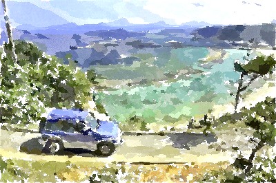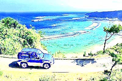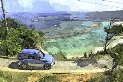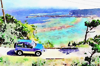 でもって、今回送られてきた水彩画タッチがこちら。もうすっかり暑中見舞い用の絵葉書です。沖縄ってところはどこでどう撮っても絵になるんだよきっと。とも思ったけれど、元の撮影の際、このすれ違い不可能の道に、よりによって他車がやってきてしまったという逸話も聞いているので、よじ登って、シャッターを切ってすぐさま転がり落ちて(そこまでひどくない)と、彼女だってそれなりに苦労をしていらっしゃるのです。