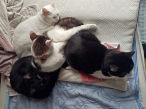 洗濯物を取り込みに戻った午後。 リビングにも隣の和室にも居ないなーと思いながら 二階に行ったら、布団の上にひと塊の猫ず。 ん-まあ涼しいよね、いきなり。 ホットカーペットなんてまだ出さないから 自力でよろしく(笑)