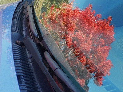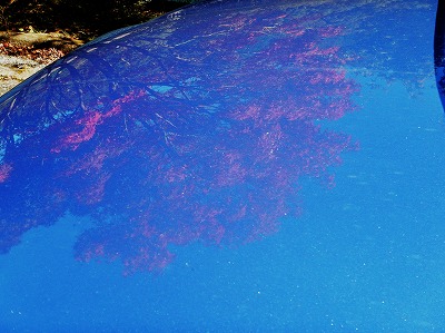 メガトン怪獣に降ってこられたらBLUEらすかるなどぺしゃんこですからそれは願い下げですが、天高い秋空そのものが写りこんでくれるのは歓迎です。朱の背景に青いものが紛れ込むと、主観としてはきれいには思えないのに、その逆だと青が朱を映えさせるのは不思議です。ただ、ブログ用に縮小をかけたらあまり目立たなくなってしまいました。といってトリミングしたら何を伝えたいのかもわからなくなってしまうところが撮り手の下手さを露呈しています。