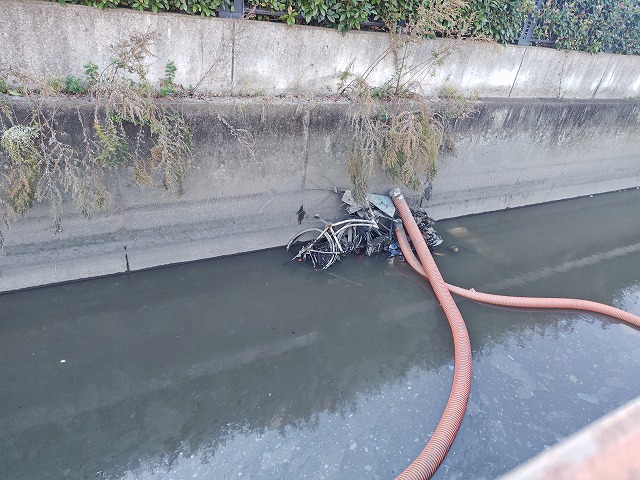 近所の用水で浚渫工事中。 溜まった土砂の撤去と書いてあったけど 水抜いて露になったのは大量のゴミ。 自転車やホイルやフェンス(!)等々 てんこ盛りですよ。 これって税金で処分するんですよねぇ・・・