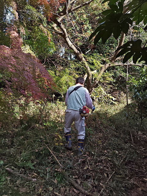 黙々と刈り払い機を操作する新月サン。