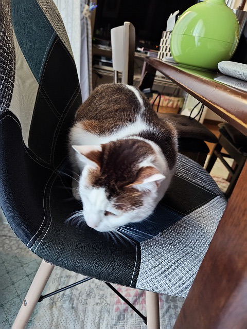 間に合わせに買ったスツールが堅いので もう一脚椅子を買おうと思って・・・ 色々探して決めた、パッチワークみたいな 可愛いファブリックの椅子。 置いたら即、はなに取られました・・・ 盛大な爪とぎ込みで(涙) 2日目でもう座面が毛羽立ってます。 結局私が座るのは堅いスツールか・・・