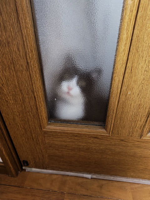 ご飯だっていうのにリビングから出て行ったいち。 こっちもその後は人間のご飯用意したりなんだりで すっかり忘れてて、さあやっと座れると思ったら ドアのガラスにぼんやりといちが・・・ いつもだったら鳴くのに、今日に限ってどうした??