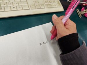 未だに痛い右手首の腱鞘炎。 先週の土曜日にもう一度診てもらったら 「書き物が原因なんだろうからペンの持ち方や ペン自体を変えてみたら?」とセンセイに 言われましたよ。 痛くない持ち方いろいろ試してみたら この持ち方で書くのが一番痛くない・・・けど これでちゃんとした字が書けるんだろうかねぇ。 (力の伝わり方が普通と違うので線がブレる)