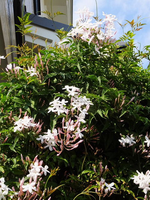 フェンスのジャスミンが咲き始めました。 週の初めに蕾が一輪プクプクに膨らんで 「おお、咲きそうだねぇ」と新月サンと 話をしたんですが。 翌日の夜には数輪開いて、だんだん繁みが 白くなってきました。