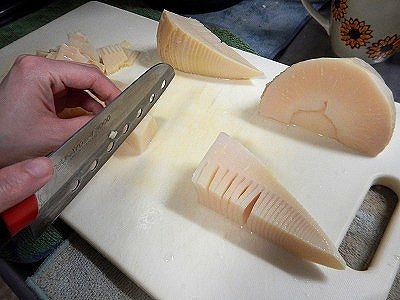 裏の畑だった今は藪に、暖かくなってイノシシが巣喰い始めたので敷地周囲に忌避剤を撒いたついでに、蹴躓かされたタケノコを掘り返してきました。そのタケノコもかなり食い散らかされていて、蹴躓くくらい無事なのがあるだけマシでしたがけっこう疲れるのよ探し出す手間は省けてるけど。京都の白子と勝負する気はさらさらありませんが、これだけでかくなっていたにもかかわらず、薄切りして刺身で食ってみるとまだエグミはなくて、よいものが採れました。