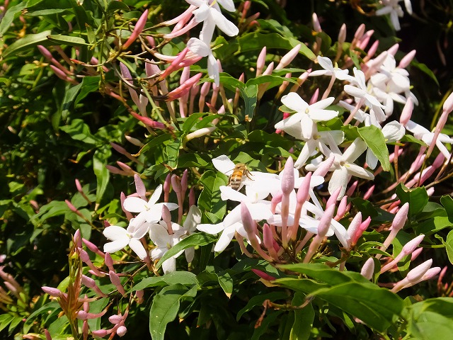 暖かい日にジャスミンに来ていたミツバチさん。 今ならモッコウバラに、ハーブの花も咲き始めたから 吸い放題よ(笑) もう少ししたらバラも咲くかな?